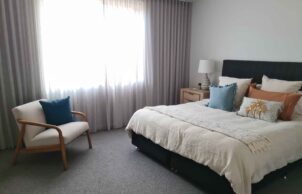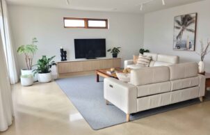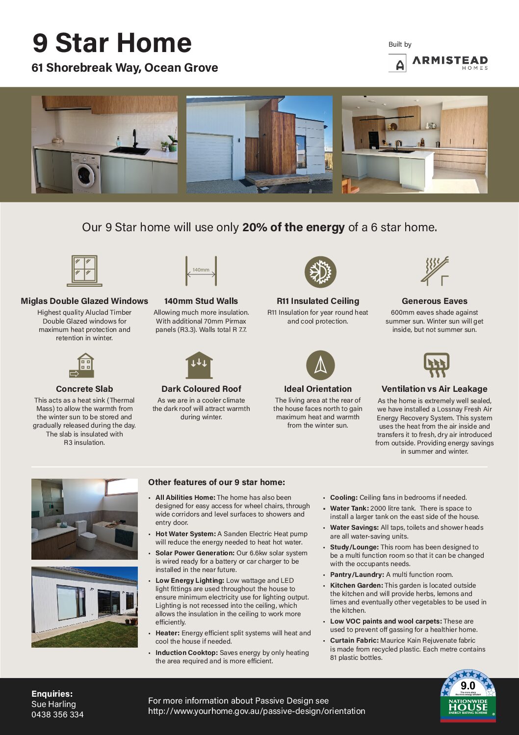 This 9-star energy-efficient home uses only 20% of the energy of a typical 6-star home. It features highly insulated R11 ceilings and R7.7 walls, Miglas double-glazed windows, and a thermally insulated concrete slab that retains winter heat. A Lossnay Fresh Air Energy Recovery System provides ventilation without heat loss, while 600mm eaves and ideal orientation maximize passive solar gain. Sustainability is enhanced with a 6.6kW solar system, energy-efficient lighting, induction cooking, and a Sanden heat pump. Designed for accessibility, the home includes wide corridors and level surfaces. Other features include low-VOC finishes, water-saving fixtures, ceiling fans, and a kitchen garden for fresh produce.