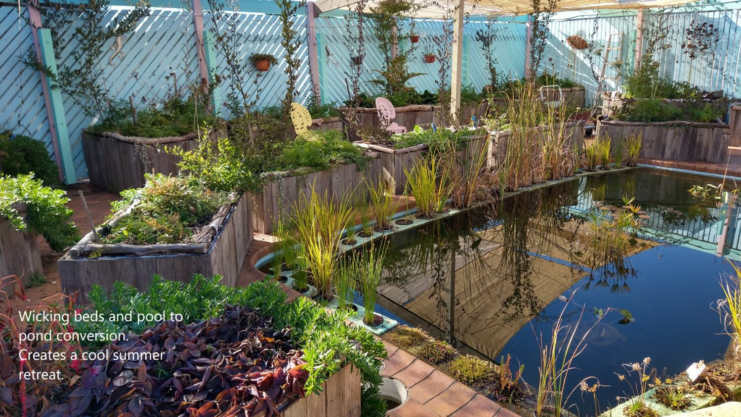 Other changes include installing a small tank and pump to recycle the washing machine water onto the garden and converting the swimming pool into a pond with plants and fish. This is surrounded by wicking beds providing a lovely cool retreat in summer. The pool was a big user of power and chemicals but over the past 3 years has not been used a lot due to Canberra being cold, windy, too hot or smokey. We don’t miss swimming a lot but we do enjoy the pond.