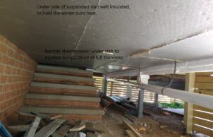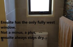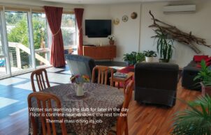 So, the final modification was to enlarge the living area, with full height windows and equally important an insulated suspended concrete slab floor, topped with dark tiles to soak up the sun’s lovely warmth. This has worked very well.