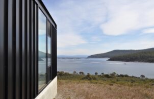 Located in a challenging high-wind outlook of the Tasman Peninsula near Port Authur, it sits on top of a rise with low-level native vegetation below – inherently bushfire risky. However, with dual qualifications in landscape and architecture, Ian Weir was especially conscious of minimising disturbance to the biodiverse vegetation when siting the house. Vehicle access arises from the safer rear orientation, whilst the dwelling retains nearly all the original site vegetation un-touched other than for large water storage tanks.