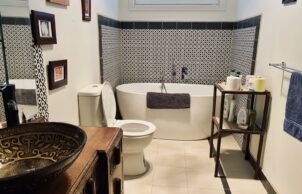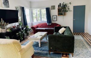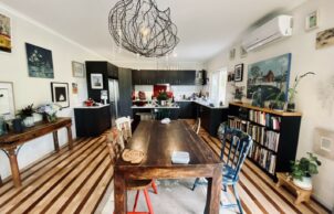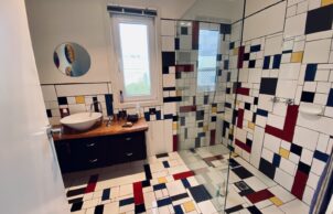 This modular home was constructed in a factory setting with minimal wastage whilst allowing for choices of sustainable materials. The house was positioned on site after some site work and did require connection with electricity and water. This process gave me 100% budget certainty whilst allowing me input with materials, type of build and layout. Custom made double glazed UPVC tilt and turn windows and sliding doors – underfloor, wall and ceiling insulation add to comfort during cold winters. A storage heater and hot water heat pump are able to take advantage of solar energy produced. Upon request I did add my personal touch to the initial built like both bathrooms and a wooden floor in the living area. Many of the materials used were recycled and reused. A garden, deck and studio behind the house complete this artists home.