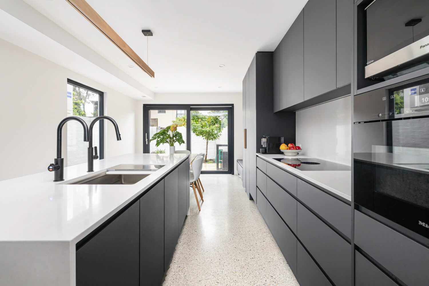 The site is a small block in Balmain – 101.2m2 with a FSR of 1:1. We wanted to add a 3rd floor with a Master bedroom for the city views. The ground floor living area, dining and kitchen was to have internal walls removed to provide a better flow so the family could entertain and prepare food whilst being able to see the children playing in the garden or living room. The office was to be tucked away in a kitchen cupboard that in the future could be used as a pantry.
