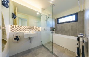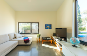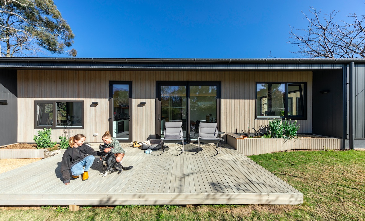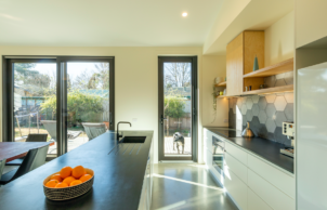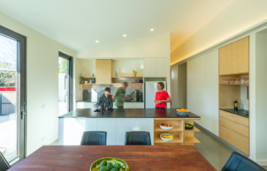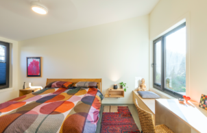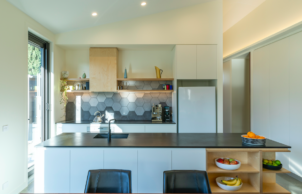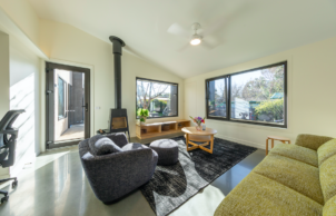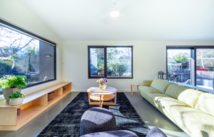 A lot of thought was put into the footprint of the house, ensuring only enough space as needed and that it was useable space. Our home faces north with eaves that shade the glazing in summer and let the sun stream in in winter. The floors are polished concrete and absorb the warmth beautifully. With insulation throughout the house is a lovely stable temperature all year around. A key innovation in this home is the achievement of high energy efficiency without high-tech, expensive construction techniques.