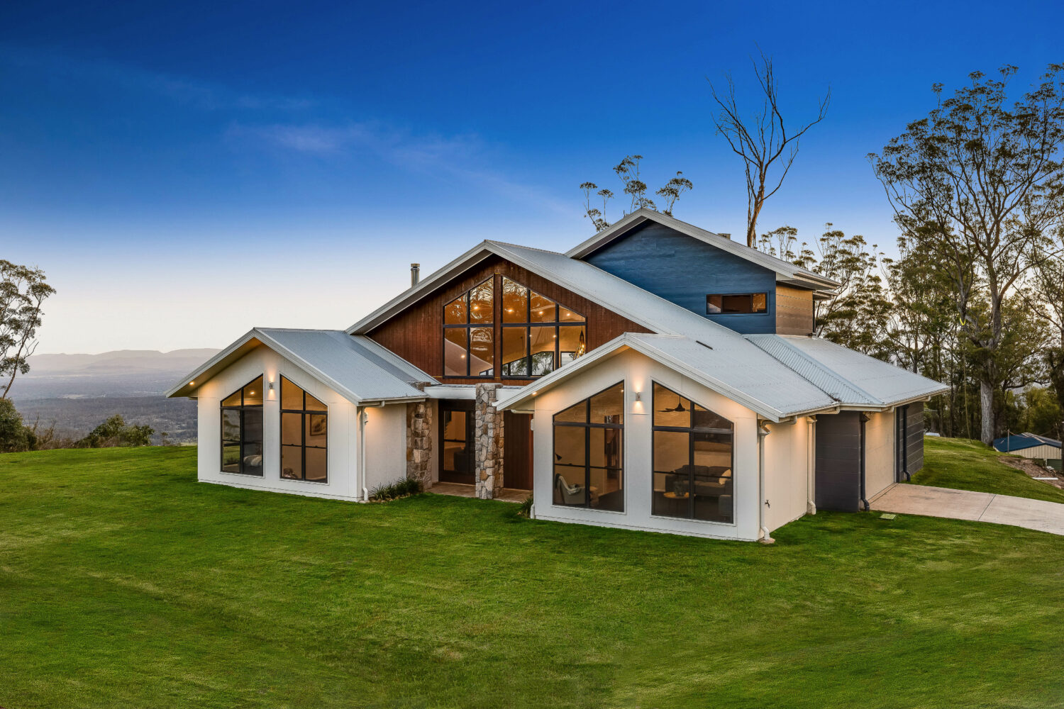 This residence was designed with open plan living to make use of natural lighting, wide open spaces and display the amazing view over the great dividing range. With textural stone pillars framing the entry and the timber clad gable, the materials create a connection between the home and surrounding landscape. Designed by Lockhart Design, built by leading sustainable home builder Geoff Gibson Homes, and with an 18kw solar system installed by Proven Energy, the house is designed to maximise airflow and retain a comfortable temperature while using minimal energy. The owners are passionate about the environment and reducing their carbon footprint, so this recently built family home was made with sustainability in mind, and designed to help realise future plans to continue reducing the owners’ impact.