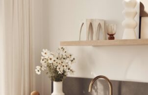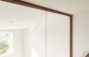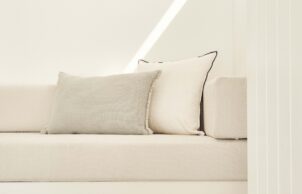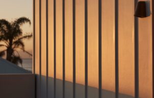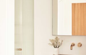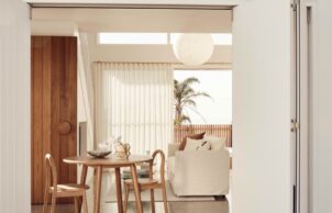 Materials specified throughout include recycled glass products, Australian made soft furnishings and fabrics and living tumbled brass finishes that will naturally patina over time and age beautifully, eliminating the need for replacement due to salt exposure. Cleverly integrated storage solutions make it possible for a family to comfortably inhabit this space. A minimalist approach was taken aesthetically, balanced with details reminiscent of the coastal vernacular of the area seeing a palette of crisp whites, and earthy grey hues and recylced timber, creating a calm and sophisticated coastal retreat.