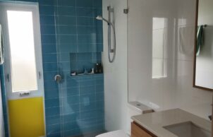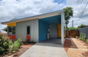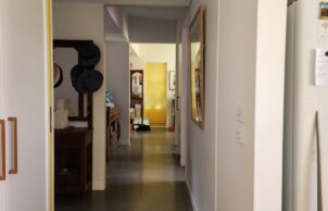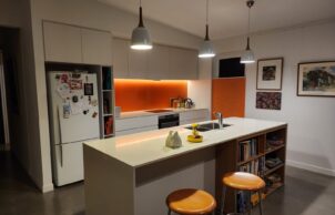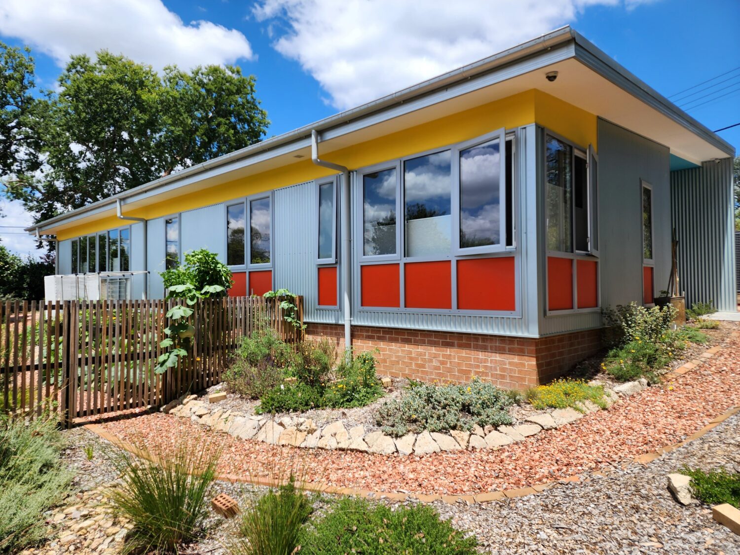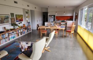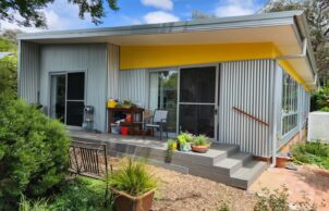 Additionally, the house boasts architectural flair, described as mid-century modern meets Australian tin shed, as an intentional contrast to the bland boxes of current new housing. It also reflects the artistic interests of its owners in having bright colours and lots of artwork.