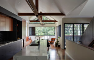Two architects renovated a post-war family home and studio on a sloping block opposite Brisbane’s Enoggera Creek, mitigating flood and bushfire attack risks through its lifted profile and resilient design. The renovation raised the house from NatHERS 0 Stars to 8.4 Stars through careful planning, materials selection and energy transformation.