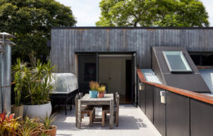 The edible garden, including a bee hive and chicken coop, is irrigated by the rainwater tank which is also plumbed to the toilets, washing machine and rooftop for solar panel wash-downs.