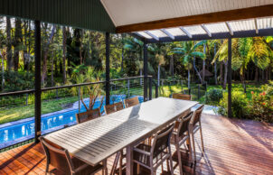 The removal of a poorly conceived bedroom allowed for the kitchen to visually extend through a casual living space to a voluminous outdoor room with a northerly aspect, connection to majestic trees and overlooking the existing interestingly shaped pool to the west.