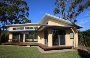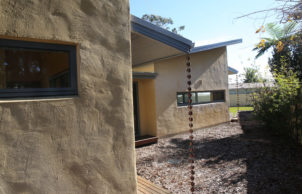 The Culburra Hemp House consists of three intersecting pavilions, two of which are tilted off parallel to the boundary to face true north for maximum solar control. The hempcrete walls provide a good combination of insulation and thermal mass. The monolithic hempcrete walls were cast on-site around a timber frame, minimising gaps between materials and, being both interior and exterior walls, they reduce the number of materials used. The hempcrete walls are vapour-permeable and the lime makes them naturally mould-resistant, creating a healthy indoor environment.