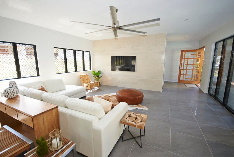 The home takes advantage of natural breezes by utilizing the largest possible openings by extensive use of louvers and bi-fold and stacking doors systems. This, along with supersized fans, results in significantly lower usage of air conditioning