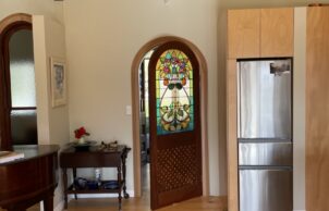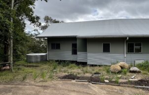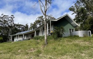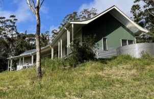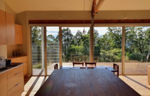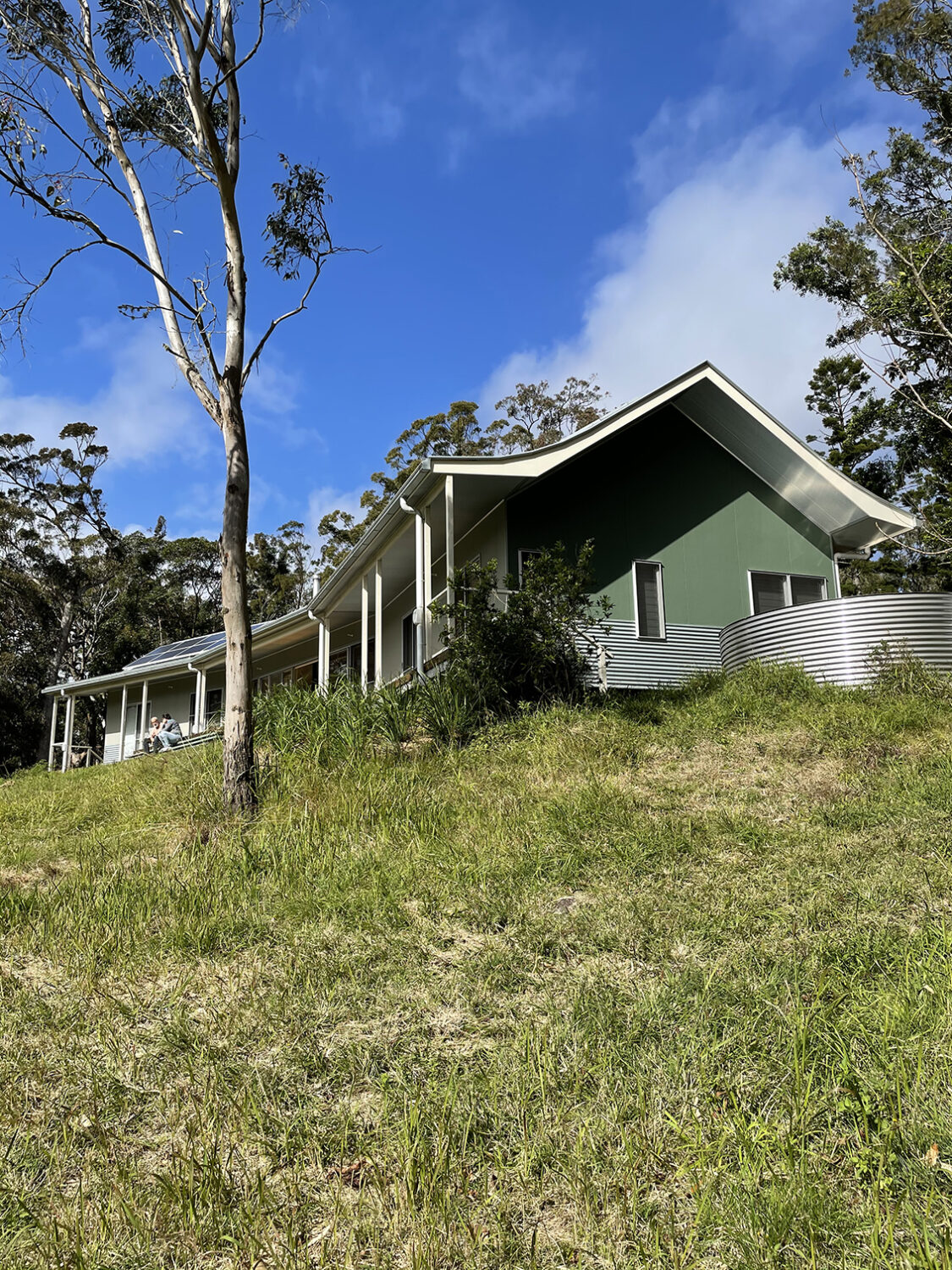 Co-founding members of Wild Mountains Environmental Education Centre have completed their private home on a neighbouring block after living at Wild Mountains for 30 years. This building features many elements of environmental, social and economic sustainability and elegantly embraces its north-facing mountain ridge. The lightweight construction minimises impact on the site but is well insulated for the mountain climate. Steel bearers chosen to minimise concrete footings support recycled hardwood floor joists beneath pine flooring felled and milled on site and cypress pine framing (local, renewable and naturally termite-proof). The steep-pitched roof is ideal for photovoltaics and was set by the 130 year old trusses (oregon which was probably a seedling 800-1000 years ago). Large openings to the north capture winter sun, views and cooling breezes.
