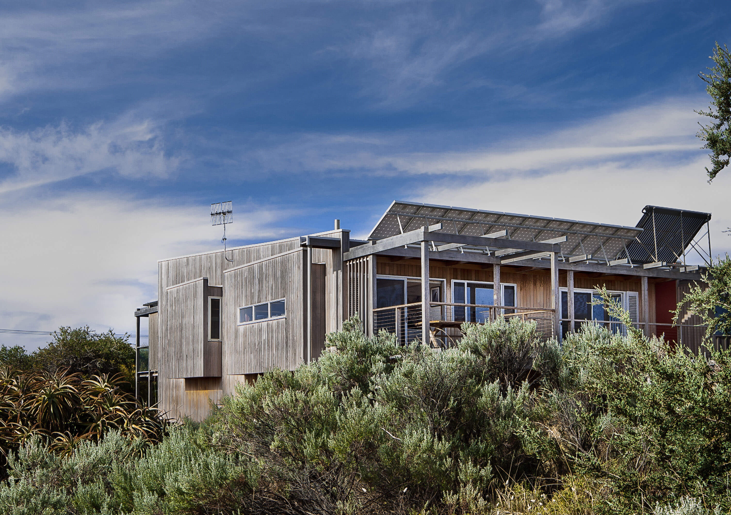 The climatic conditions are extremely variable featuring strong winds (bearing sand, salt and rain) from the south west quadrant, cooling on-shore breezes (SE to SW), hot northerlies and occasional breathless warm nights. Accordingly the house has been designed to mitigate the less pleasant conditions while maximising the benefits of the benign weather events. Timber decks to the north and south provide outdoor living opportunities in almost every kind of weather. Variable shading to the northern deck provides amenity in both winter and summer while the solar panels provide shade to the southern deck.
