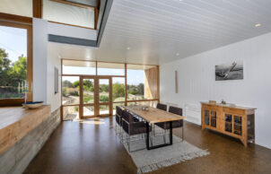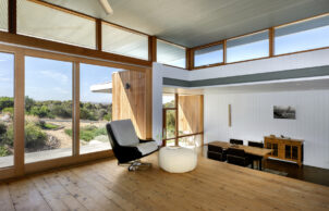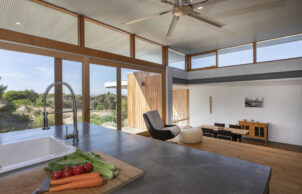 The lay out of the home is in an L-shape and gives the feeling that the gardens are wrapped around the house. The kitchen floor is raised with a meter above natural ground to respond to the sand dune on the site. The elevated floor also provides great vistas over the dune reserve and creates a visual link between the gardens.