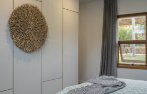 The main living area is facing the dune reserve and the orientation is NNW. The concrete floor (waffle pod) and the insulated cavity brick wall (thermal mass) keeps a comfort climate in the home through passive heating and cooling. Sustainable features like; orientation (north), shade control, cross ventilation, thermal mass, PV panels and batteries, insulation & sealing draughts are all present in the home.