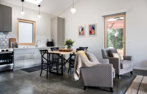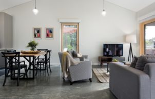 The Green Retreat is designed and built to the Passivhaus standard; this standard developed in Germany sets stringent limits on a building’s energy consumption (in particular the heating and cooling demand), whilst offering optimum thermal comfort and indoor air quality. The Passivhaus standard differs from traditional energy efficient models in the sense that, it does not rely on thermal mass and solar passive design. That said the North orientated glazing and fully insulated concrete slab certainly assist in keeping the Green Retreat comfortable year round. The use of heat recovery ventilation supports optimal thermal performance and indoor air quality with minimal input required on behalf of the occupants. Alongside implementing the Passivhaus principles the project was also modeled using FirstRate5 and achieved a rating of 9.1 Stars.