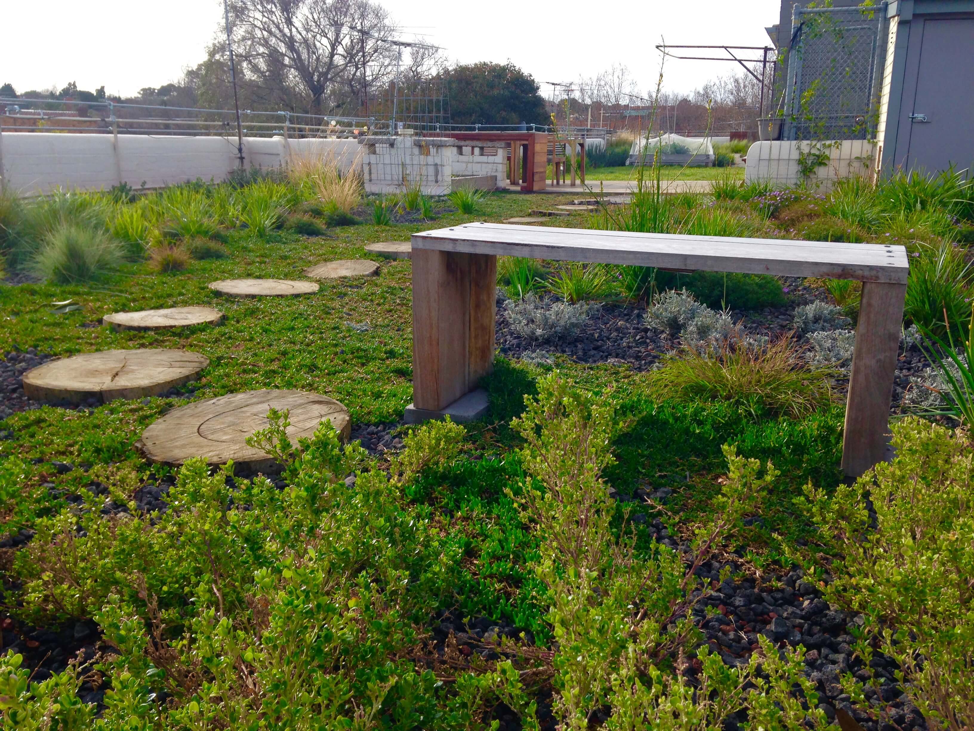 Come and visit the 646 square metres of retrofitted green roof, covering three-quarters of the roof space. Surrounded by the existing brickwork parapet, the green roof includes two lawn areas, planter boxes for vegies, washing lines, a network of paths and three decks, but most of the space is given over to native plantings. The only non-natives are rosemary and lavender, to attract bees and assist biodiversity.