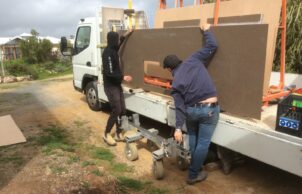 North facing timber frame on concrete slab. Colorbond gable roof for simplicity, low maintenance, ease of solar installation, and rainwater harvesting. Front wall cladded with Hebel panels and other walls with Scion Stria compressed cement boards.