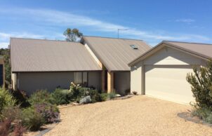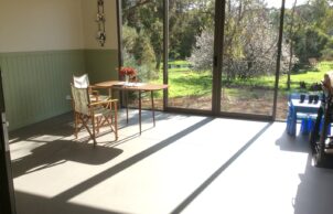 Heating is by solar gain through Northern windows and a sunroom. The sunroom helps to heat the home and is a cosy retreat on sunny winter days. It is well insulated and has a low thermal mass. It’s not artificially heated or cooled but can be used most days of the year. On cold nights it is isolated from the main home with a double glazed sliding door and pelmeted curtains, which stop heats loss from the main section of the house. On hot days during summer the sunroom doors are opened to outside but the door to the house is closed.