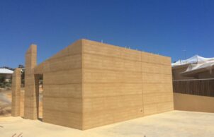 A Rammed Earth Wall (REW) forms the central spine of the house and is completely within the insulated envelope. Sunroom on the NorthWest corner.
