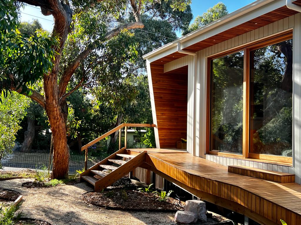 Our site had never been built on, and was home to numerous Messmate Stringybark trees, Golden Wattles and Giant Honey Myrtles. We were able to identify the ideal balance by maintaining some of the best trees on the block ensuring the building didn’t encroach into their structural root zones. Meaning we didn’t jeopardise the native context whilst also meeting stringent bushfire safety requirements.