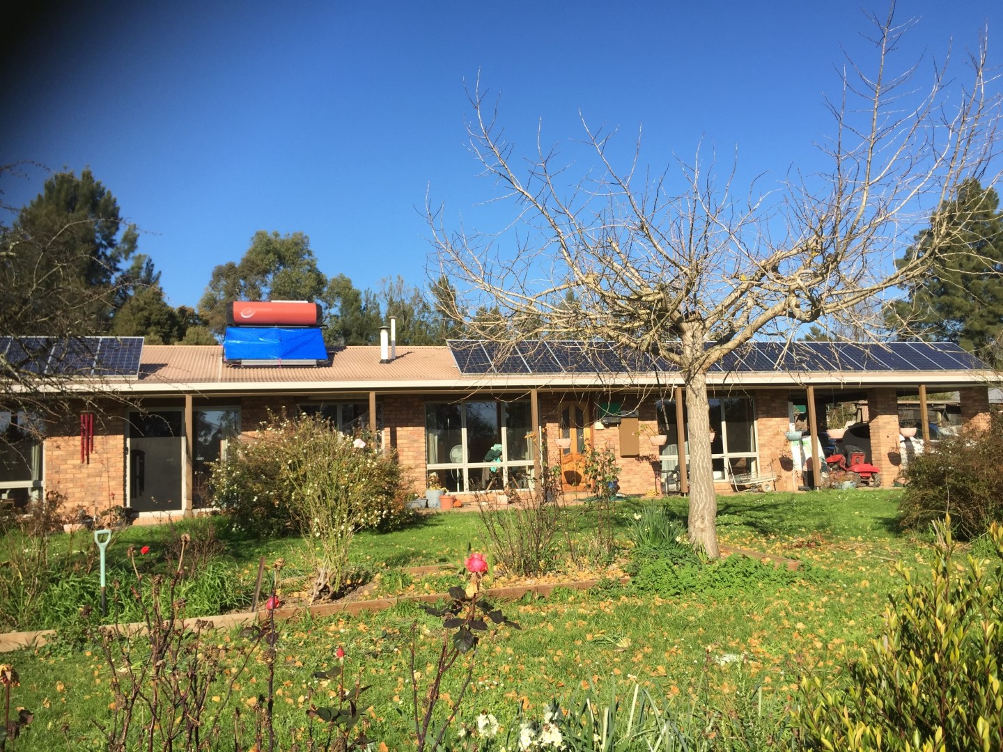 Designed for energy efficiency 30 years ago by the owners having had a long interest in energy efficient housing and having climate change in mind and having listened to Dr Graeme Pearman from CSIRO being interviewed on the science show on ABC radio, we purchased a 4 hectare block of land and unlike the norm, instead of the house facing the road we ran the house east west so the house faced north with a large area of glazing which gives solar gain in winter but having put on a 1200mm wide eave to the north which cuts out the sun mid spring till mid autumn.