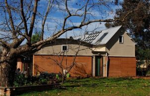 The interior is finished in a combination of rendered mud and plasterboard, with ceilings of straw panel. There is an underground tank for greywater and a composting toilet. The corrugated iron roof supports panels for a grid-interactive solar power system (the panels are currently being replaced). The kitchen benches are recycled timber slabs and other materials have been used wherever possible. There is an outdoor mud brick pizza oven.