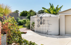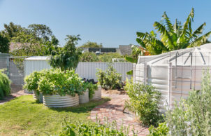 Planting zones where created around the property and plants were specifically located based on their tolerances and the sun cycle. A tropical zone was created along the shed line as the heat reflects off the shed creating the perfect climate for bananas, mangos, avocados and other tropical species. The herb garden was planted alongside the garden ramp for accessibility and close proximity to the kitchen. The owners have also grown a variety of citrus trees around the rainwater tank and trained them to develop in the espalier pattern. This was chosen for decorative purposes but also in order to increase the trees fruit production. At the rear of the property a gleditsia tree has been planted for its seasonal benefits, in the summer it produces leaves to shelter the seasonal vegetable garden beneath from the harsh sun and in winter it sheds its leave to allow the sunlight through.
