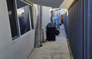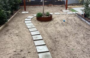 • Rear garden: To reduce temperatures and water usage we removed everything (the grass had died) including about 9cu meters of sand and buried building rubble. Brought in soil and fertilizers to adjust pH, built a pergola to the rear for shade, planted a Peppermint tree and an artificial pear tree, A Jasmin wall, a lilly pilly hedge and created borders for native plants and installed compost bin for our vegetation waste.