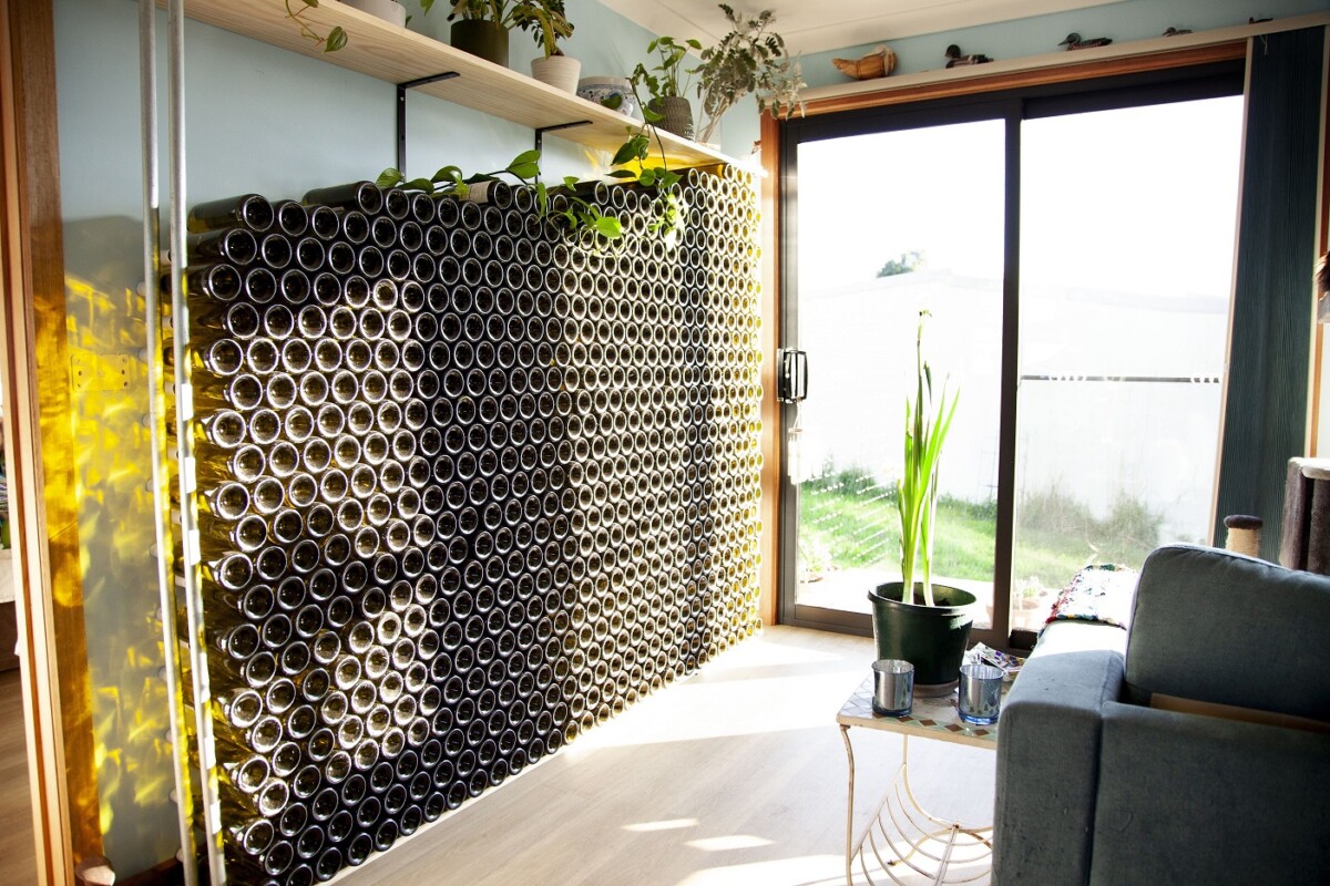 – Designed it to have thermal mass made from wine bottles stacked up on the living room walls, with reinforced sub-floor, thus saving the cost of a concrete slab.