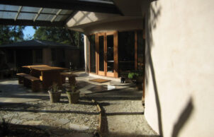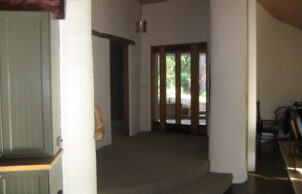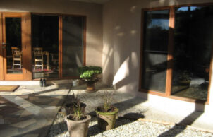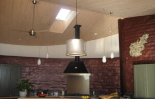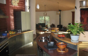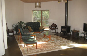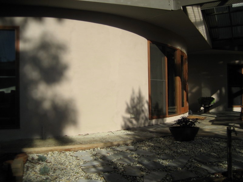 We wanted to create a sustainable house to benefit the environment by reducing the production of carbon dioxide and reducing the running costs of the house. All of the external walls of the house are straw bale and most of the internal walls are mud brick. All of the windows are double glazed. The house has a lot of curved walls, which does mean some compromise in eve width and window orientation, however most windows are NE, N or NW and eve widths are a minimum of 600mm. Windows facing WNW and W have external blinds. The house has very good ventilation capabilities with an openable skylight at the high point of the cathedral ceilings, the hot air rising draws in cooler air through the windows. The ceilings are insulated with R3.5 polyester batts and foil sarking, the house is on an uninsulated concrete slab. We do not have mains water or sewer connection, we harvest our rain water and have a worm farm waste system. We are mains electricity connected but have 6.5 kW of solar, we have a heat pump hot water system, no air conditioning and our only heating, used in evenings over the colder months is a combustion fire.