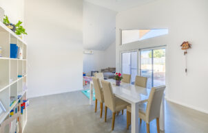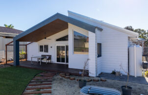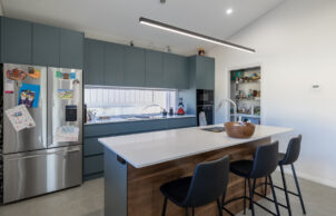 Both Monique and Steve made many conscious decisions on this home and one in particular which is simply wonderful. The choice to include traditional weatherboard claddings to the majority of the home externally compliments the streetscapes very well and is quite quaint in its impact on the design. The distinct choice to then alter the design to a more contemporary feel to the rear of the home is simply breath-taking. High raking timber lined ceilings with high performance polymer rendered insulated wall panels, a hardwood deck and beautiful high performance UPVC windows complimented by a huge lift and slide door are all magnificent features to the rear of the home. The rear of the home plays host to a very large open plan kitchen living and dining room area which then opens up to the beautiful expanse which is the outdoor entertaining area. One of the key design features of these spaces would have to be the continuous and almost seamless shadow line raking ceilings to both the internal and external areas boasting floor to ceiling glass. Burnished concrete floors throughout the home are inviting, warm to the touch thanks to the passive house performance and create a beautiful seamless floor finish throughout complemented by the fact that all our sealers are low VOC.