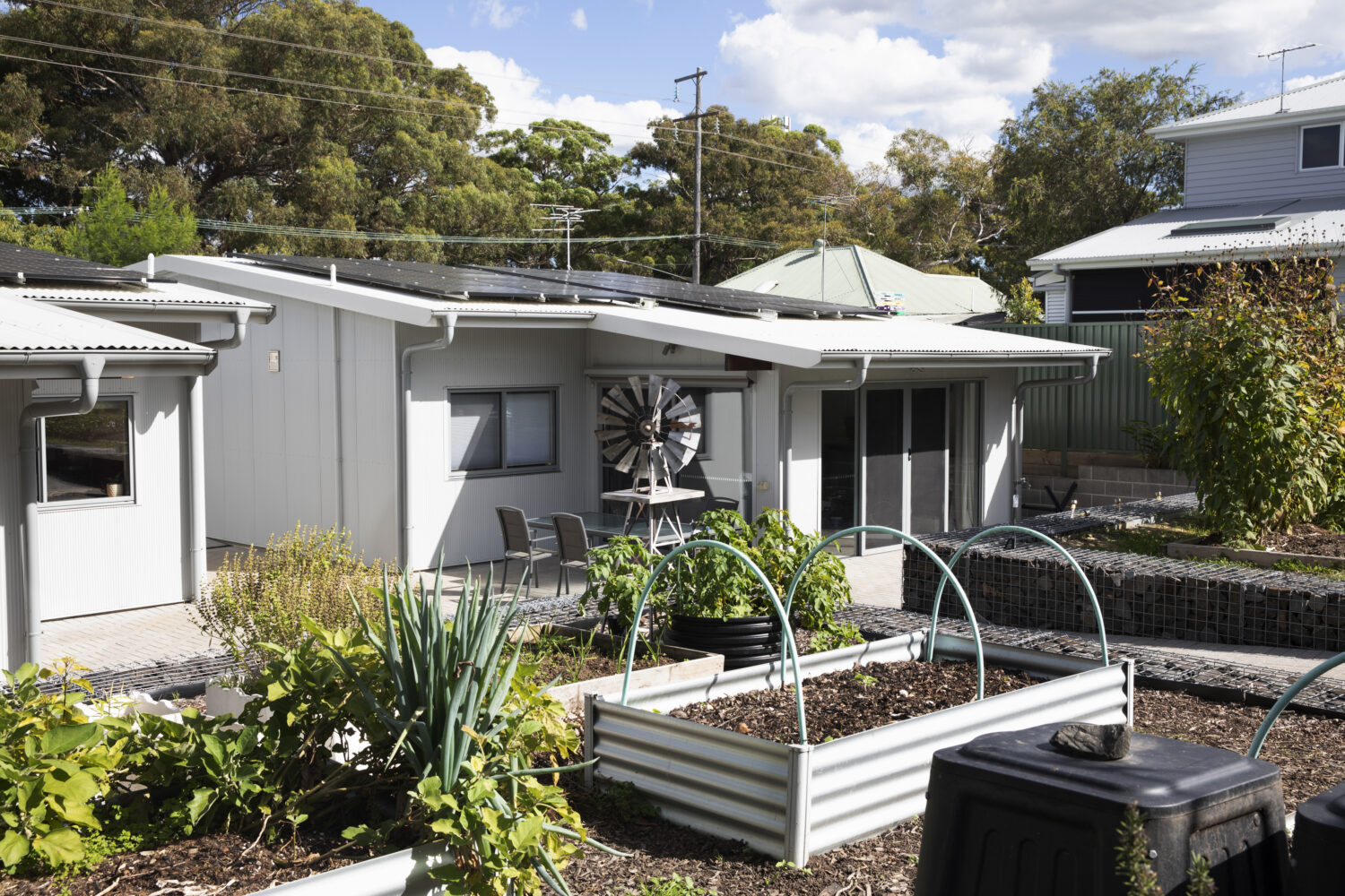 Social and environmental sustainability features have led to financial sustainability outcomes. Electricity usage is low, even now that we charge an EV at home. We can minimise our use of grid electricity by monitoring usage and solar production. Hence, most electricity bills since we moved in have been in credit. Using low-flow taps minimises our water usage and, therefore, our water bills. Our veggie garden provides us (and neighbours) with low-cost, delicious, fresh seasonal veggies all year. In 2022, we saved over 2 tonnes of food scraps from landfill.