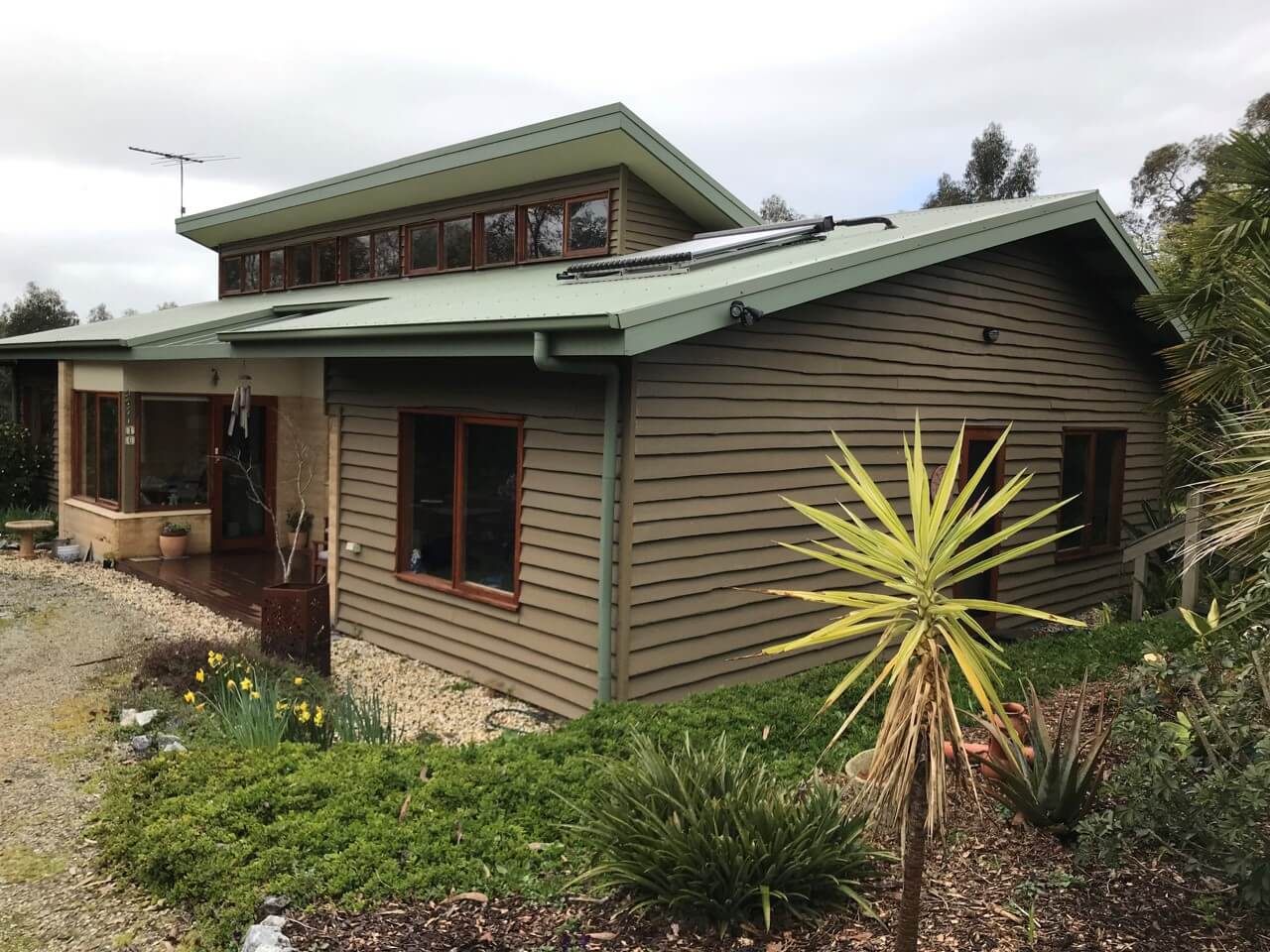 OTHER SUSTAINABLE FEATURES: P.V. panels feed into grid, solar hot water, 5000gal rainwater tank (town water also available). Cooling/heating wood stove – also used for cooking, fans in all rooms. LED and low energy lighting.