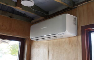 There are none of the typical problems of a normal house. There are no air leaks, it is super insulated to prevent heat losses and gains, has 100% fresh air using heat recovery to help maintain a comfortable temperature, with no mould or condensation on any surface, and is dust and insect free. Any emissions from materials, food, or humans are continually exhausted. A tiny backup reverse cycle air conditioner (1.5kW consumption) is sufficient to deal with any extreme conditions such as a heat wave or large numbers of visitors.