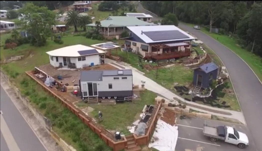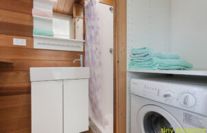 Leading off the kitchen is a combined bathroom/laundry, which includes a compost toilet, sink, shower, washing machine, clothes storage and fold-down bench made from quality recycled timber.