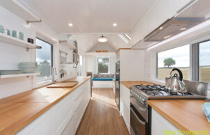 The Mayflower also features a loft bedroom with enough space to comfortably fit a queen-size bed and sideboard for additional clothes storage. Recycled timber has been used where possible throughout this home.