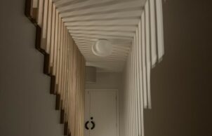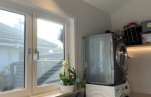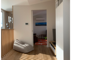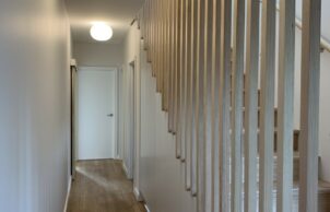 From the new front door, painted green against the dark painted brickwork, the Vic Ash timber staircase leads the eye up to both ornamental and functional balustrade. The internal roofline provides fun and interest to the new living spaces. Each room is bespoke, including laundry and bathrooms and is designed to capture light and sky where possible.