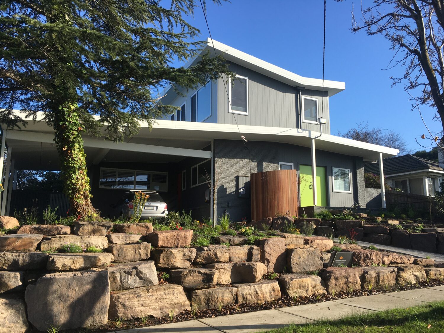 An extension of the carport displays the honesty of structural beams, and provide visual interest from the kitchen window.