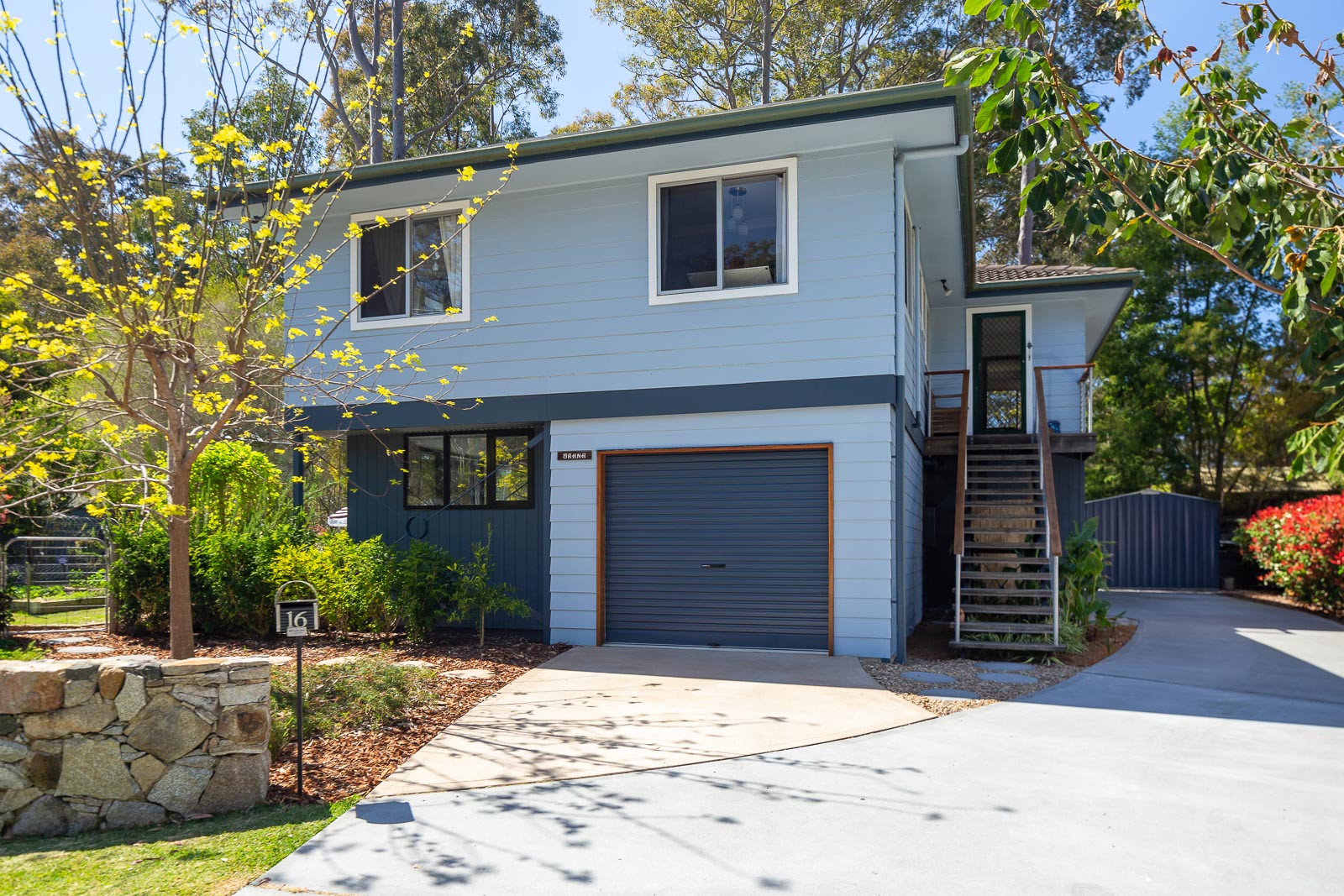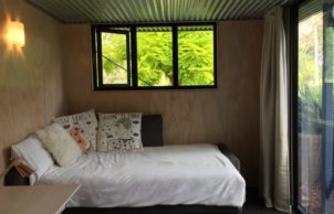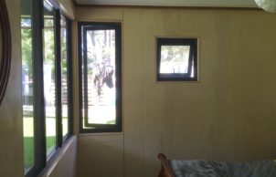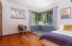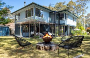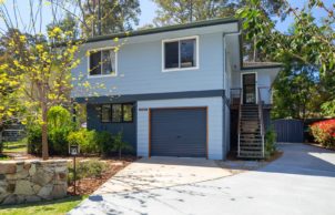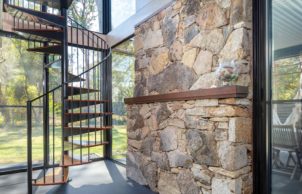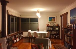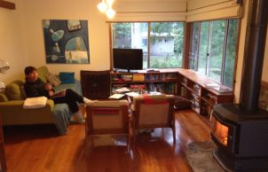 We relocated a small existing house, saving costs and around 15 years worth of embodied energy… set it up high and built below using passive solar principles to make a wonderful home for a family of four. Our home has a lovely outlook to Mossy Point spotted gum forest. Unique sustainable aspects for our home new areas are local natural materials, including local granite stone, plywood wall lining, compressed hardwood cladding, recycled windows, north-facing low-e and double glazing, recycled or recyclable materials. Careful design of the orientation, thermal mass, insulation and shading means our home is naturally warm in winter and cool in summer. It has a strong connection to its place in the environment.