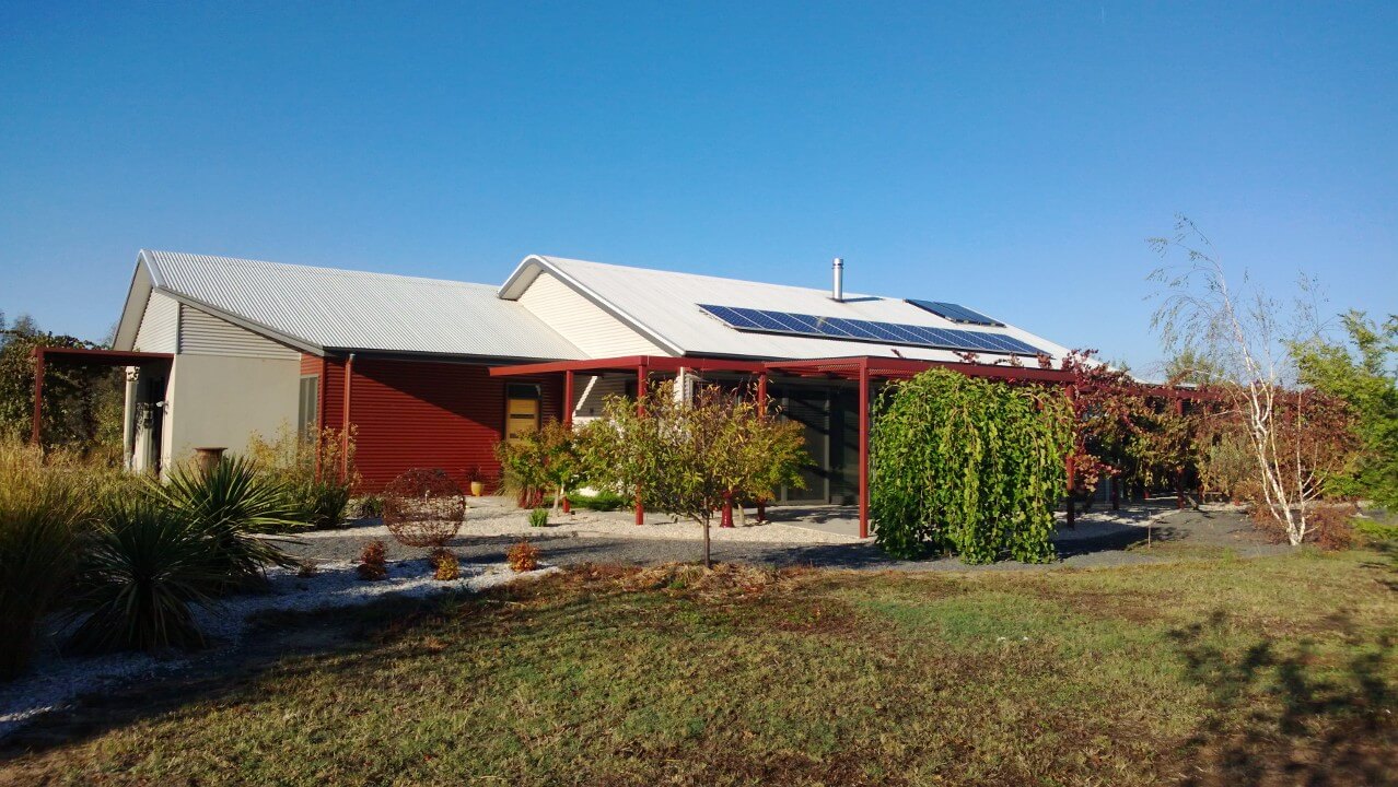 The house is protected from summer heat with double glazed windows, block out blinds, insulation, pergola roof slats, grape vines on north and east, carport designed on west side for heat reduction, tree planting and orchard to the west, cooling effect of swimming pool and dam. In 2013 a ducted evaporative air conditioning system was installed.