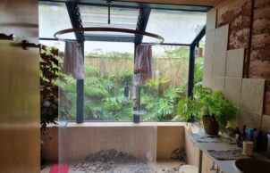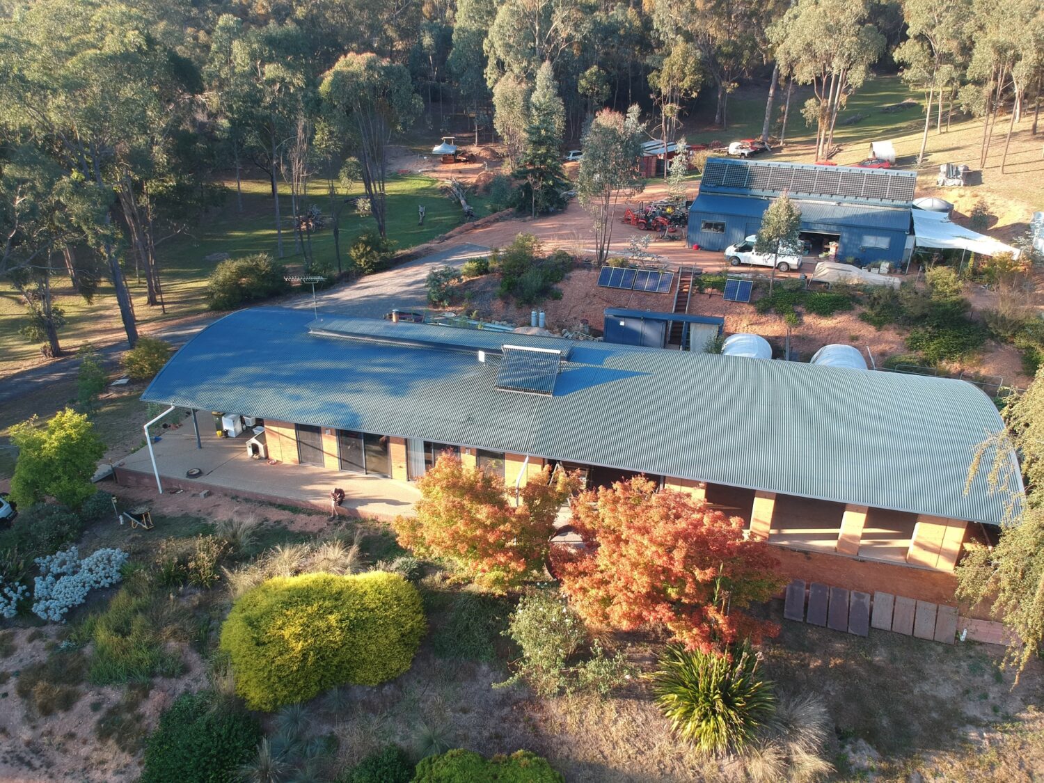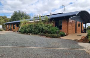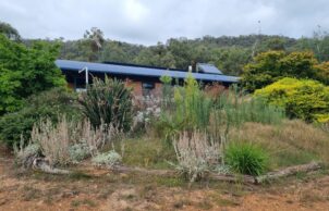With self sufficiency foremost in our minds, we set out to build a low impact high efficiency passive solar home for our family. Built in 2 stages, we moved in in 2008, and presently the 2nd stage is nearing completion. The only outside connections to society are phones and NBN. Rainwater is collected into a 150 kl tank supplemented by a bore as needed. Power is home made with 5.6 kW solar and 54 kW of batteries. Waste is consumed in our “worm” septic and used to irrigate the home orchard. The property uses permaculture principals and land regeneration to encourage biodiversity.