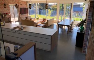 This is a new home built after many years in the planning. The goal was to create a warm, bright, airy and comfortable but low energy home in which my wife and I could enjoy our retirement. We were able to do a lot of research and were then closely involved in the design and construction. The combination of extensive north facing glass, careful insulation and a large amount of thermal mass means the house requires no heating except on overcast days in the coldest months of the year, while typically maintaining a comfortable 20 to 23C. The house is all electric and with 10kW of solar panels and is a net exporter of energy over the year.