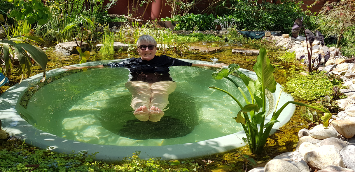 Natural swimming pond based on European principles. A DIY pond created by the retired owner set in a small private granny flat garden of low maintenance plants. Motivated by 20 years as a farmer in a drought stricken area, looking for submersion in chemical free during the increasingly hot summers. Recycled concrete retaining wall, holds a pond with plants in a gravel bed filter with recirculating water via a small low energy pool pump run during the hours my solar system is active. The swim zone is created with an old circular spa shell. It is a favourite place for the local birds, many bees and insects.
