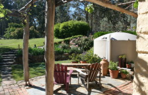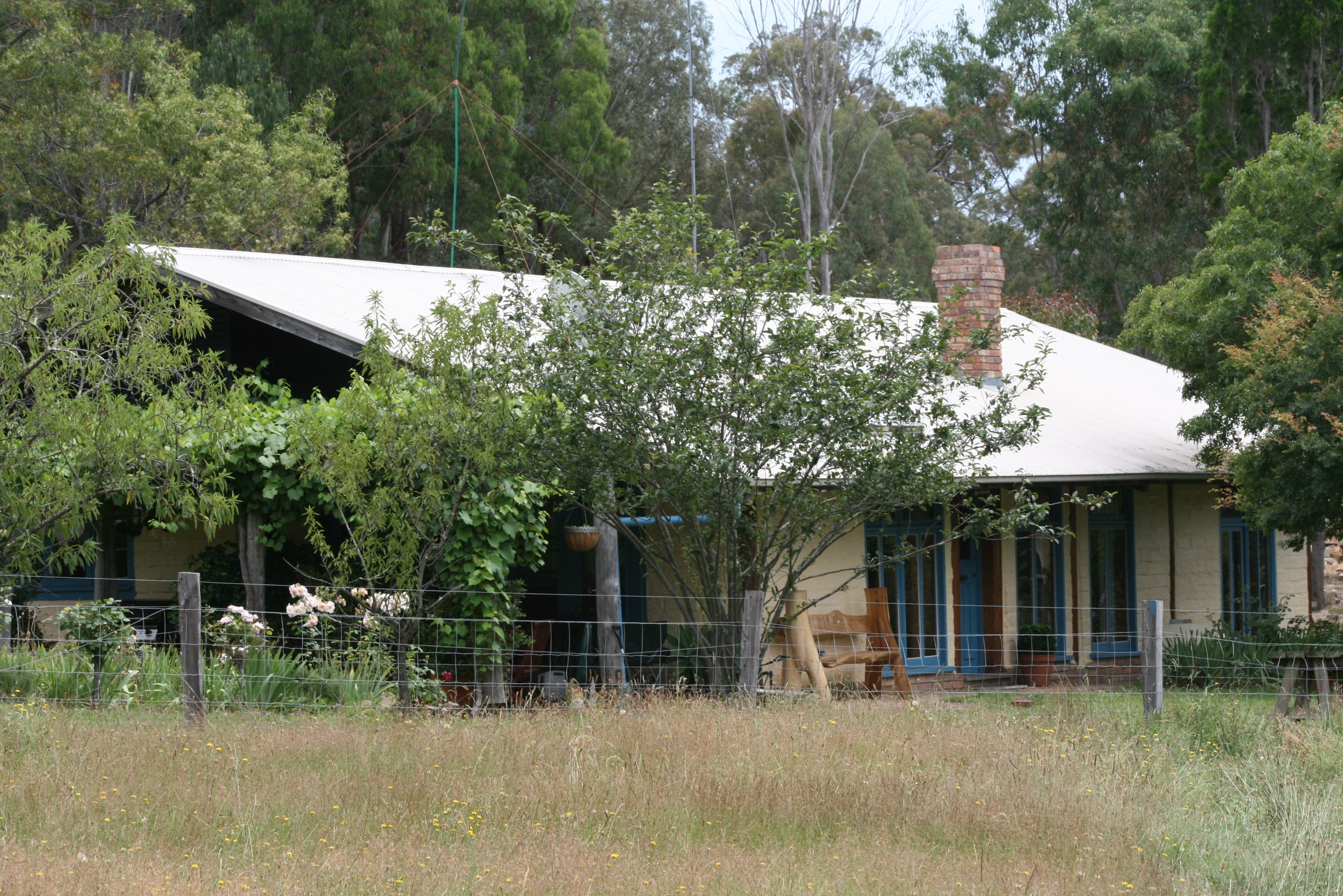 An extensive orchard is enclosed to keep most of the local birdlife out. Surplus fruit is bottled during the summer. Also within the cage is a productive vegetable and berry garden. Rainwater tanks provide household water although the toilet uses dam water. The gardens use water from dams or the bore installed 10 years ago.