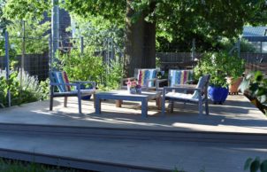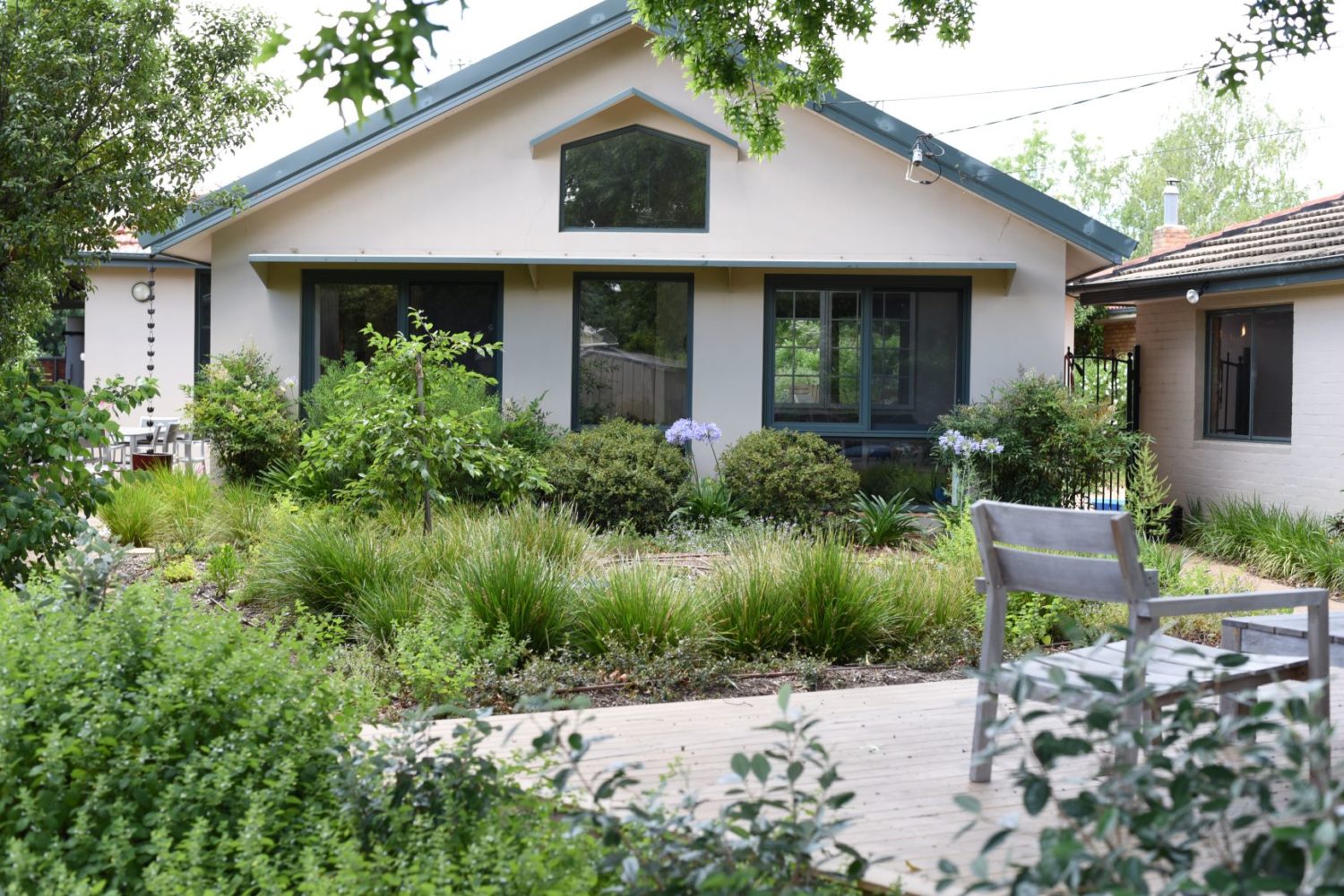 In 2014, we had our back garden landscaped, which included the removal of all lawn, a Modwood deck, a mix of native and exotic plantings, a herb garden, some fruit trees and other permanent edible plantings, a swale directing water into the garden from a disconnected downpipe with rain chain, and drip irrigation. The garden also has a small vegetable patch, which is productive throughout the year.