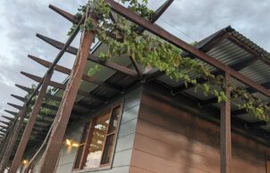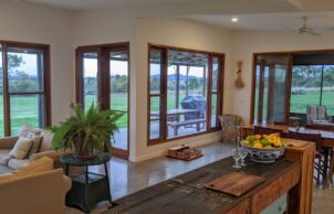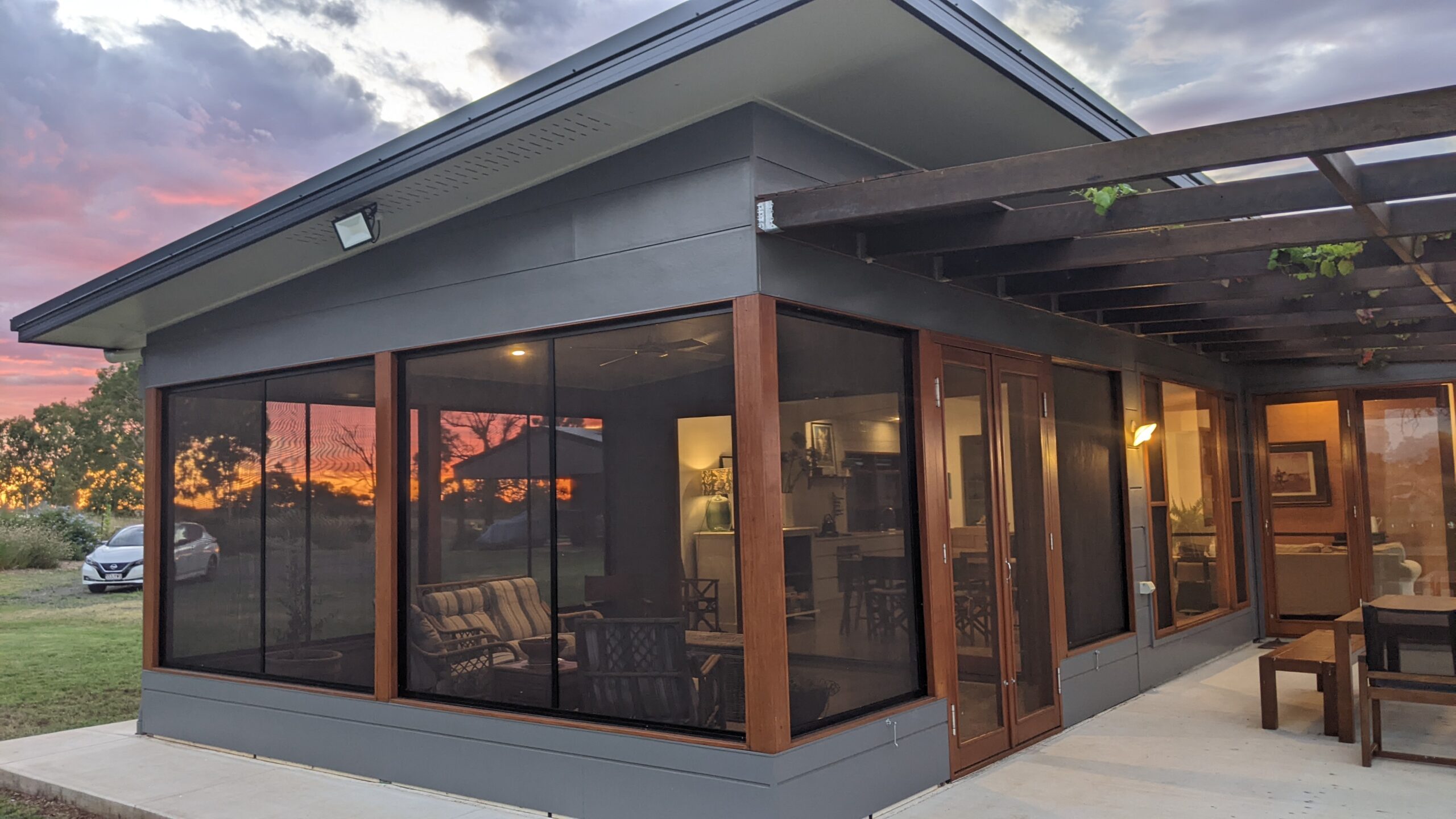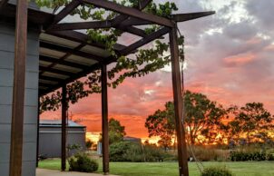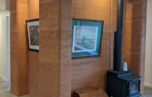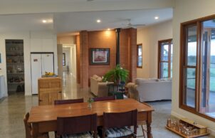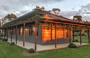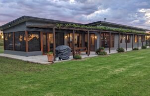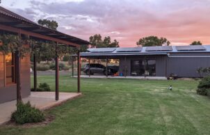 Built to a modest budget, this 8.9 star home was completed in May 2021. The home features Wagner’s Earth Friendly Concrete, which reduces CO2 emissions associated with conventional Portland cement by 80 to 90% according to the manufacturers. All concrete floors throughout the home have a polished finish which maximises the benefit of thermal mass provided by the slab. Additional thermal mass internally is provided with a feature rammed earth section of wall. Timber framed windows with Low E glass to the living areas help to achieve the high energy rating because of the insulating properties of the complete window assemblies. The room layout ensures that all living areas & bedrooms are north facing for winter passive solar heating. Deciduous vines are growing on the west facing pergola and the north facing pergola to reduce heat gain in summer.