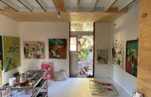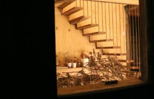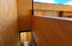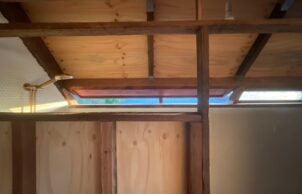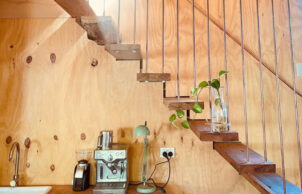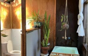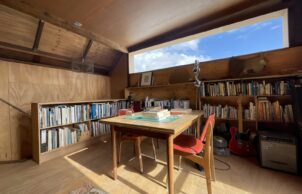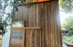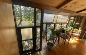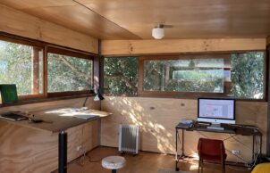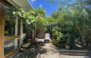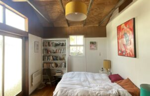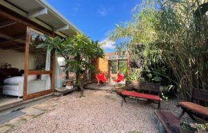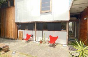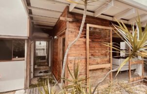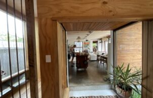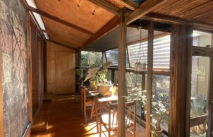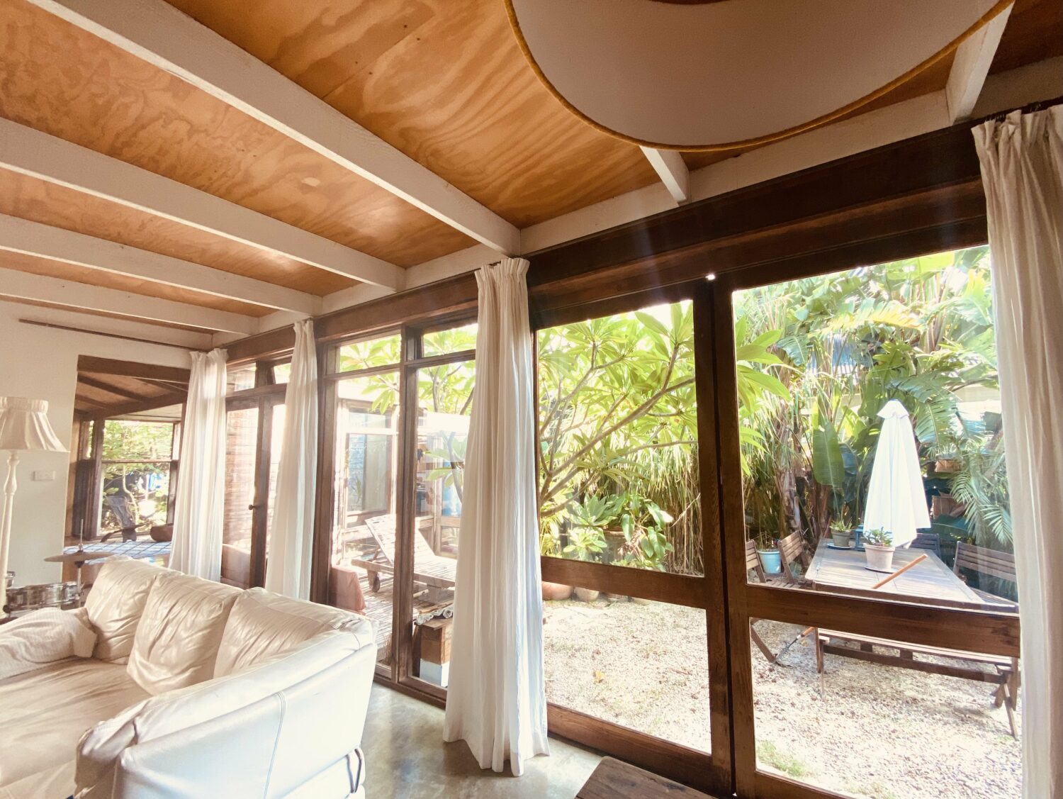 The original building on site was a one bedroom cottage built in 1942 for the American pilots stationed at the airstrip on Trafalgar avenue – there was a garage built later and an outdoor toilet, all on the small relatively small 495sqm block with neighbours on three sides and two mature Lilly Pilly trees on the street boundary. The idea was to refurbish and link the existing structures so that a series of courtyards still separated the series of buildings seprated by glazed corridors like a train. This brings light and ocean breezes and there is no need for aircon even on the hottest days – hte house creates its own air circulation. It is a zero carbon building, except for the burnished slab and plantation pine ceilings, this low cost house design incorporates all reused, repurposed salvaged material which is not dressed, uses the patinas and the history of the materials to create cosy and soulful atmosphere. The spaces are separated by courtyads and linked by glazed corridore and vestibules. The elongated plan arrangement reorients the linked spaces to the North maximizing solar heat in winter while preventing any sun entering the house in summer with adequate eaves. It was built by a husband and wife team using recycled Australian hardwood ,panels of entire floors cut out of houses before the bulldozers moved in, slavaged western red cedar glazing, toughened glass from decomissioned pool fences, billowing curtains from stage set calico, 8m long Douglass fir painted beams sourced from demolition , furniture, light fittings , air, sunshine..everything carefully sourced and placed to achieve a very low cast and very low embodied energy building that is a joy to live in and very practical to use. The spatial flexibility has proven very functional when the two kids were still living at home as the separation of spaces with small courtyards and organisation of parents, work areas and kids areas on opposite sides of living and socializing central space.