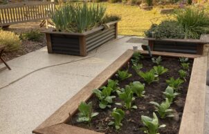 Garden designed for minimum water use and maximum wildlife attraction with linked ponds, water recirculating and bird baths. Seven wicking beds for growing vegetables and herbs for kitchen use with espaliered orchard along fence.