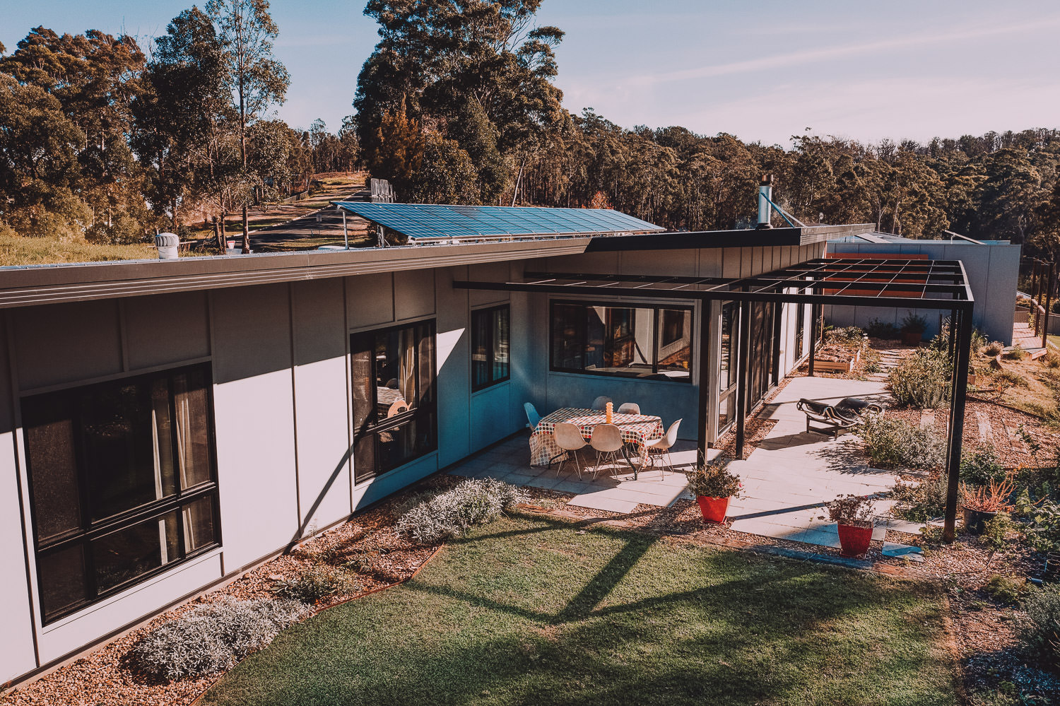 In 2018 we added a detached office and studio to the site, this is a solar passive office, that uses recycled materials and good design to ensure a sustainable outcome. Paul is an Accredited Building Designer, Sustainability Design Specialist and Landscape Architect and runs ‘Paul Dolphin Designs‘ – an award winning building design practice from this office.